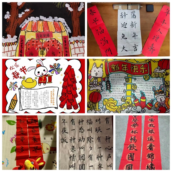 活动共分为四个板块,师生共同发现年味,分享年味。首先是“绘出新的一年”,同学们用书法,绘画,手抄报等作品分享自己身边的幸福,营造出浓厚的新年氛围,表现出他们对新的一年的美好期盼;其二是“按下快门键”,在该板块中,师生用自己手中的相机,捕捉身边的精彩瞬间,用一张张照片留住家乡新年的模样,发现新年的美好;其三是“厨房中的温暖“,在该活动中,师生们晒出了厨房里的年味,弘扬了“劳动春节,感恩家人”的理念;其四是“年夜饭”专题,在该活动中,大家纷纷晒出自家的年夜饭,尽显祥和热闹欢快气氛。春节,离不开的是团圆和喜庆,年味,最浓的无疑是那顿年夜饭,寄托着对新一年的美好向往和殷切希望。